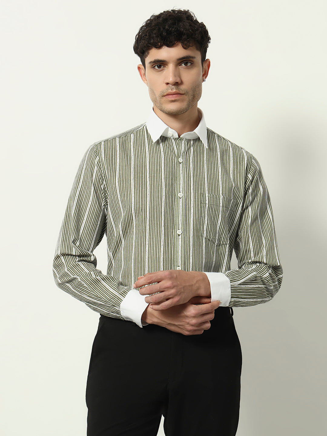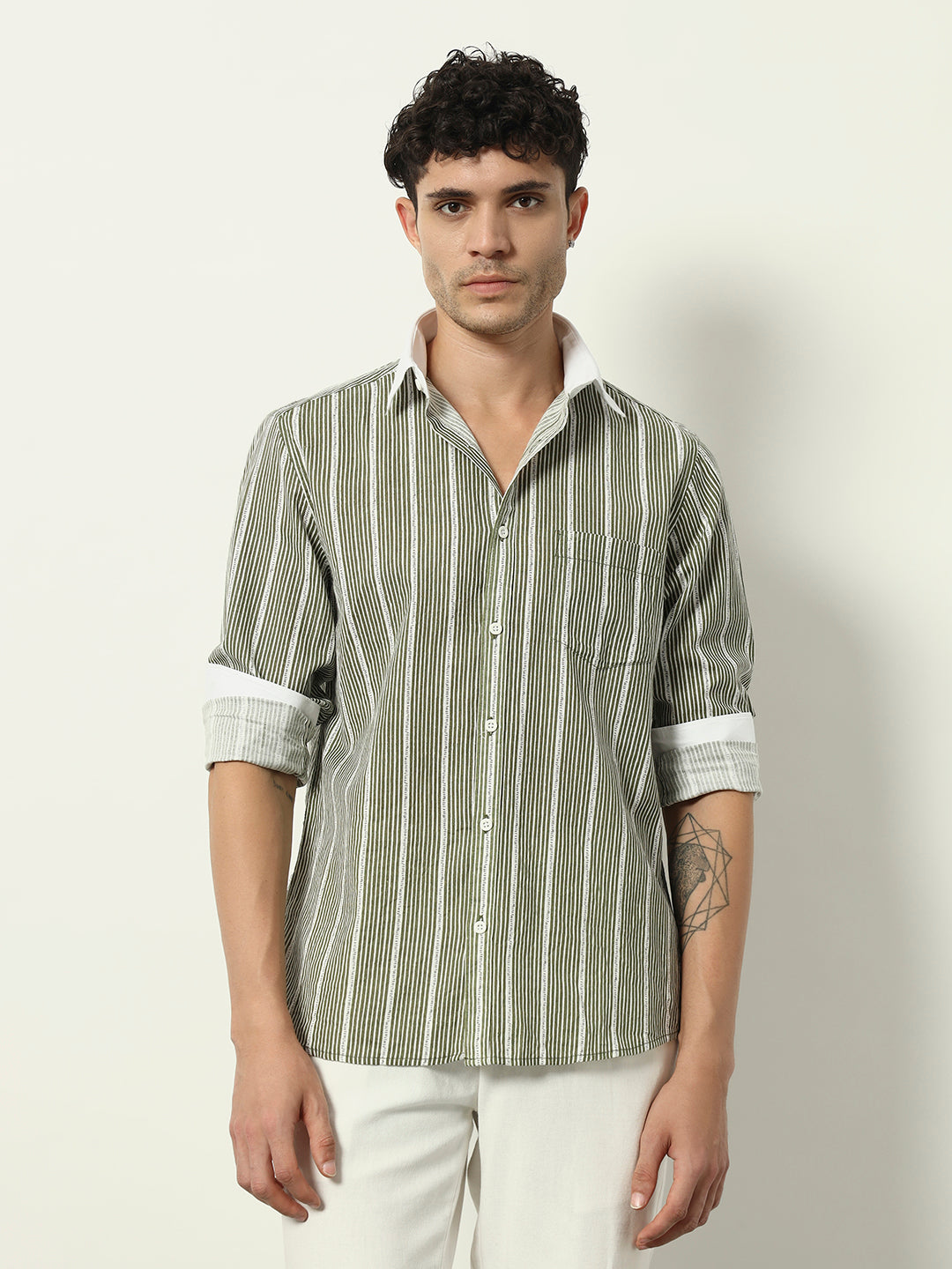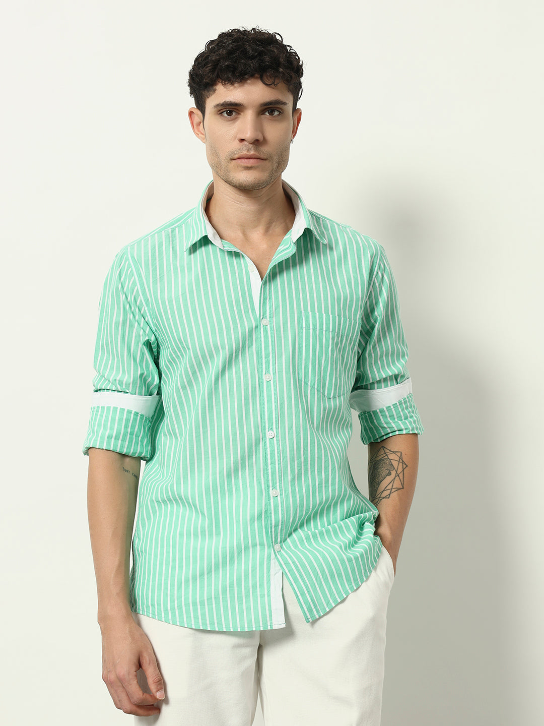Green & White Vertical Striped Long Sleeve Shirt for Men