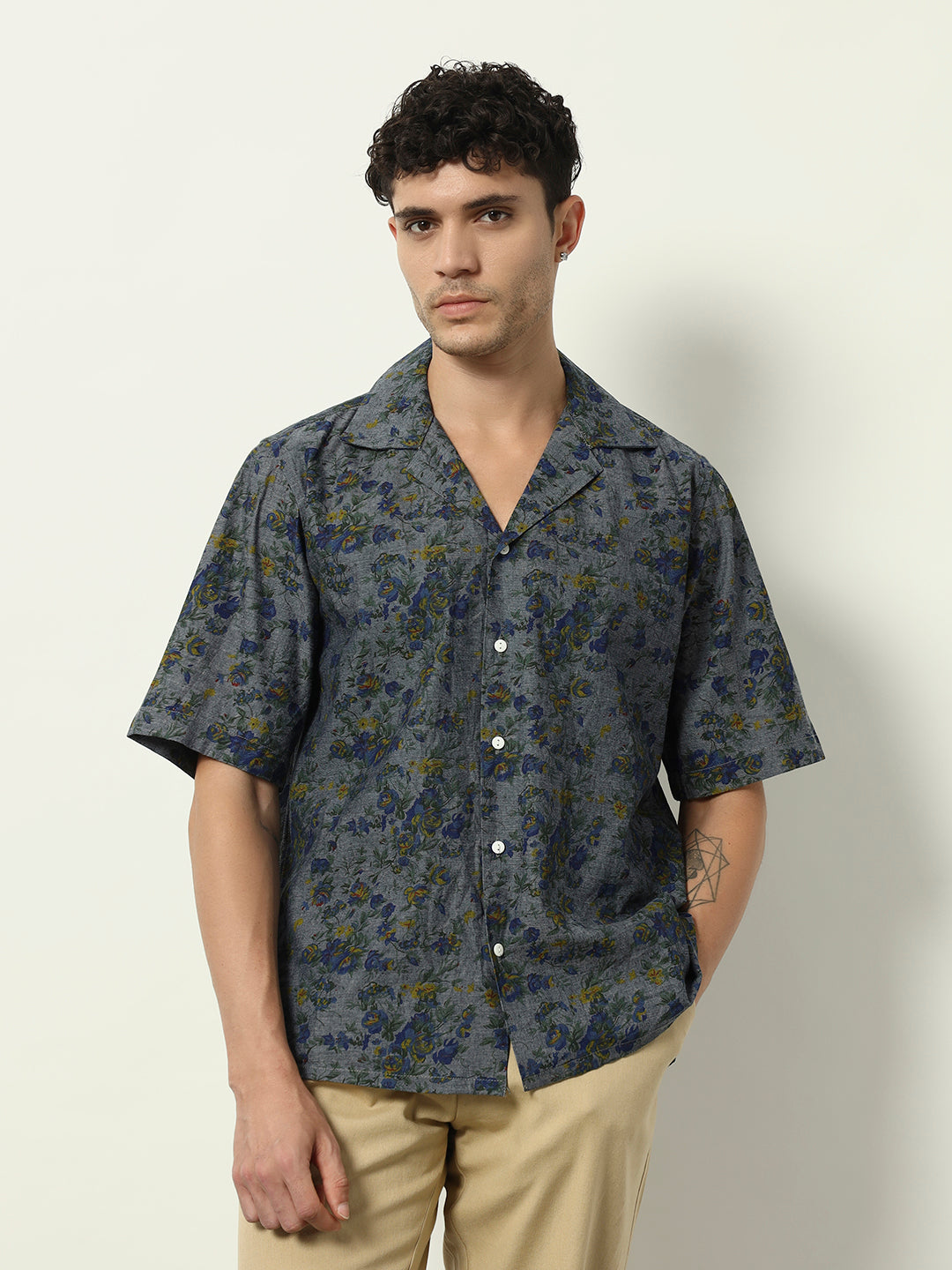 Indigo Bloom: Modern Floral Cuban-Collar Shirt