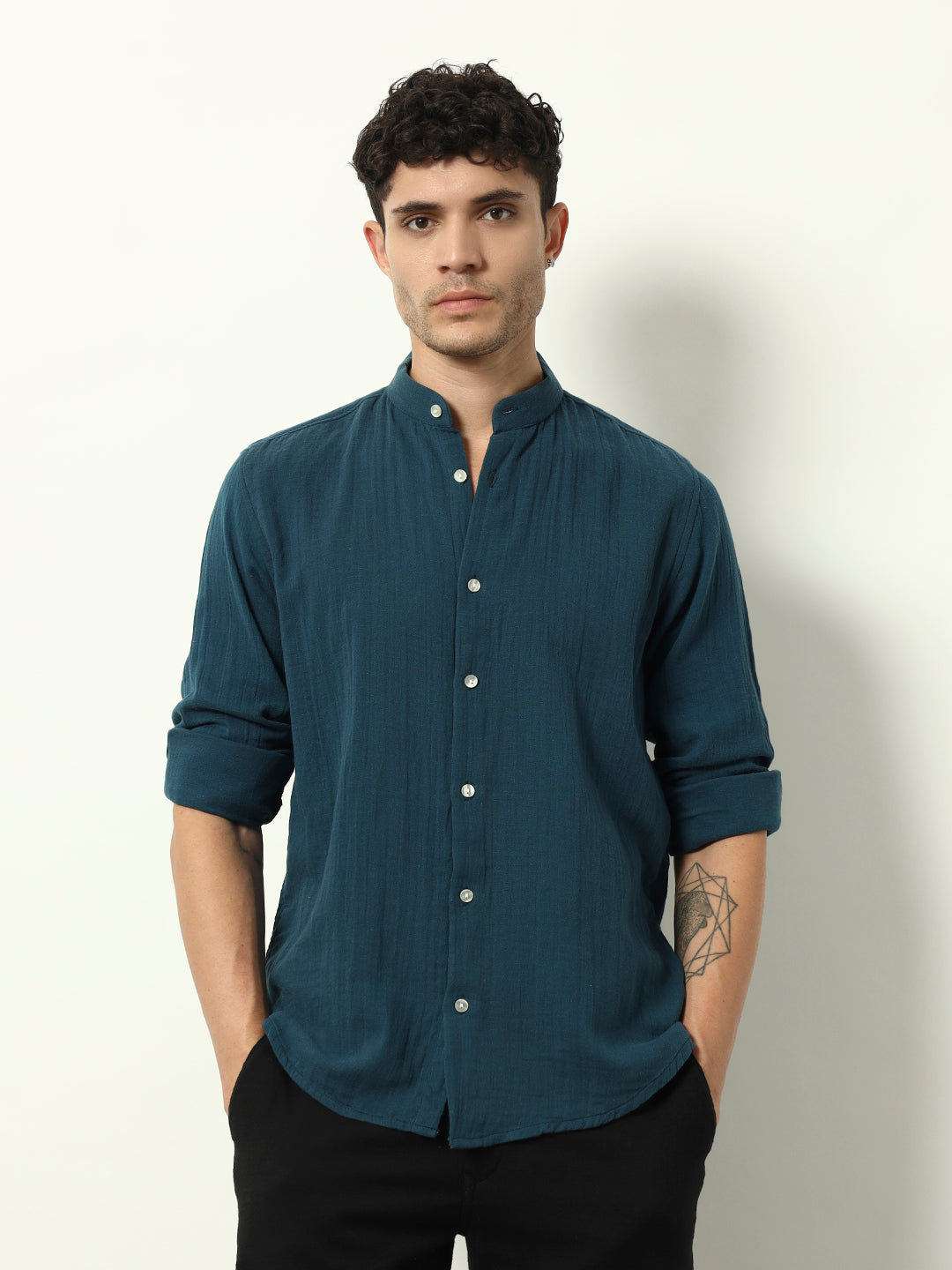 Step into sleek sophistication with the Teal Mode, a collarless shirt designed for the modern...