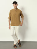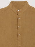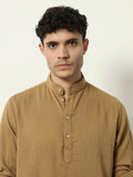 Crafted in a deep mustard-brown hue reminiscent of wind-swept desert sands at dusk, The Saffron Dune Kurta blends artisanal tradition with sculptural minimalism. Tailored from premium textured cotton, the silhouette features a structured mandarin collar, clean placket detailing, and a relaxed yet regal drape—evoking the timeless grace of desert royalty.